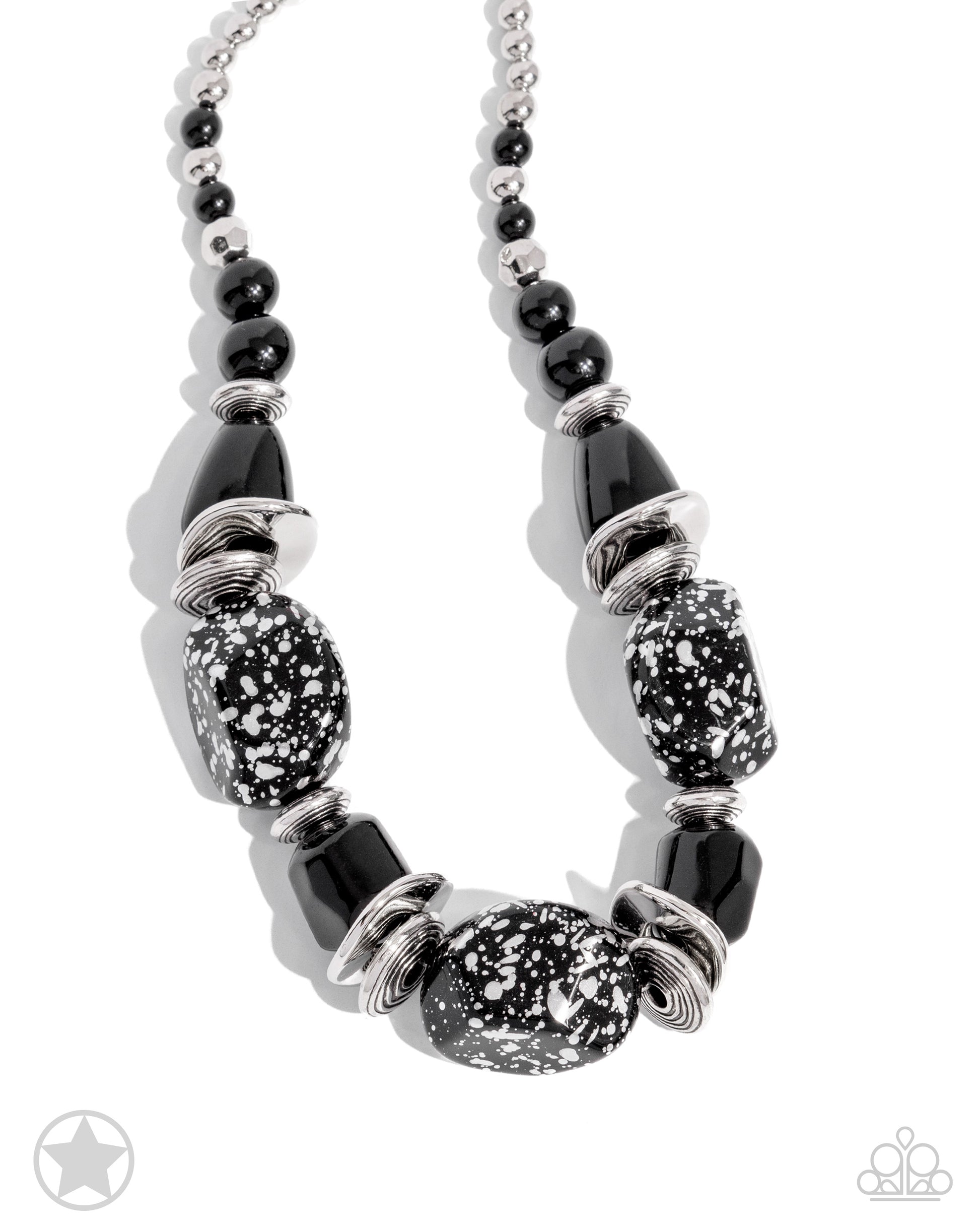 Chunky black beads with speckles of silver and a gorgeous glazed finish are threaded together with thick silver rings and smooth black beads. Features an adjustable clasp closure.