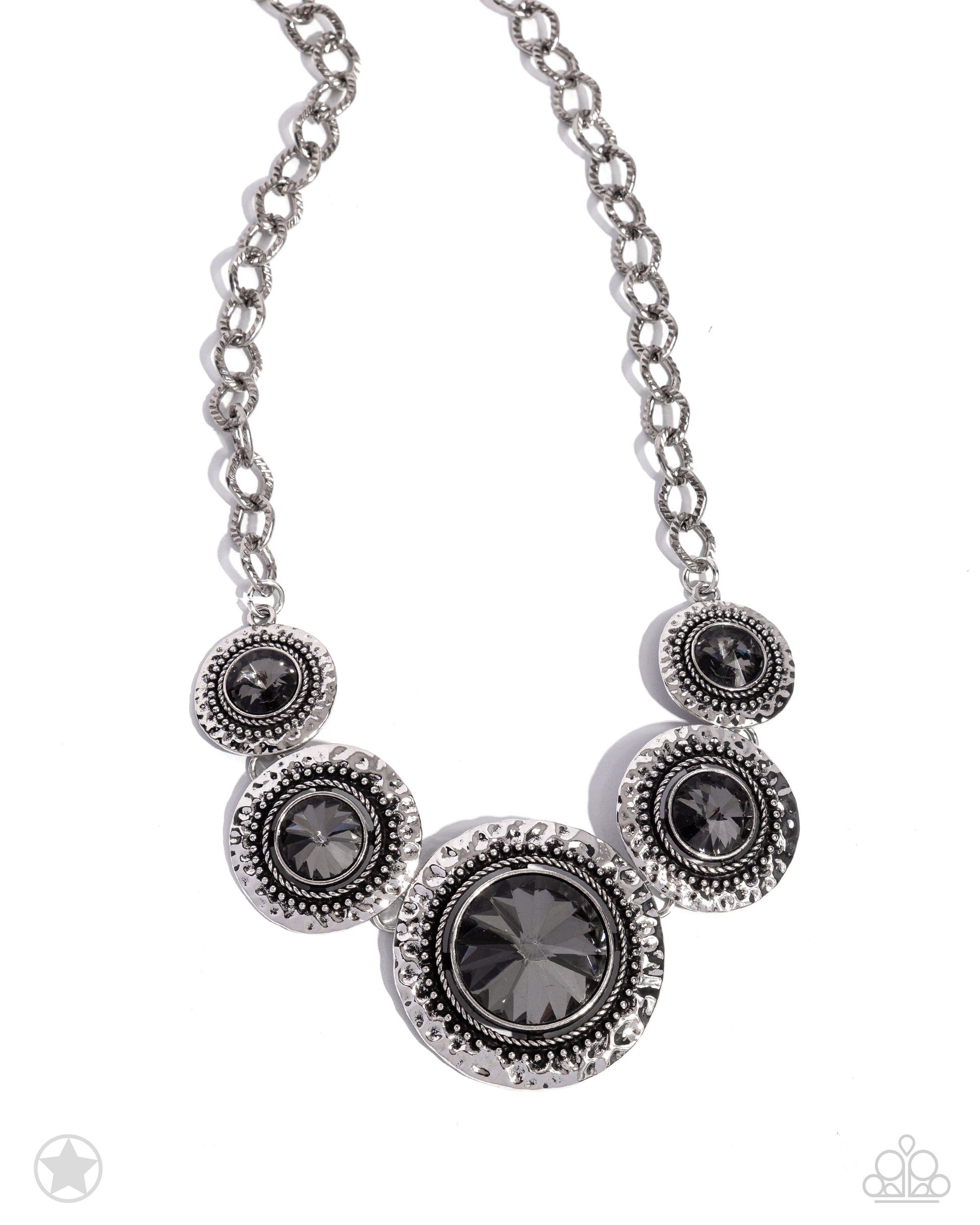 Gradually increasing in size, dramatically oversized smoky gems are pressed into the centers of hammered and silver studded frames. The blinding frames link below the collar for a glamorous, statement-making finish. Features an adjustable clasp closure.