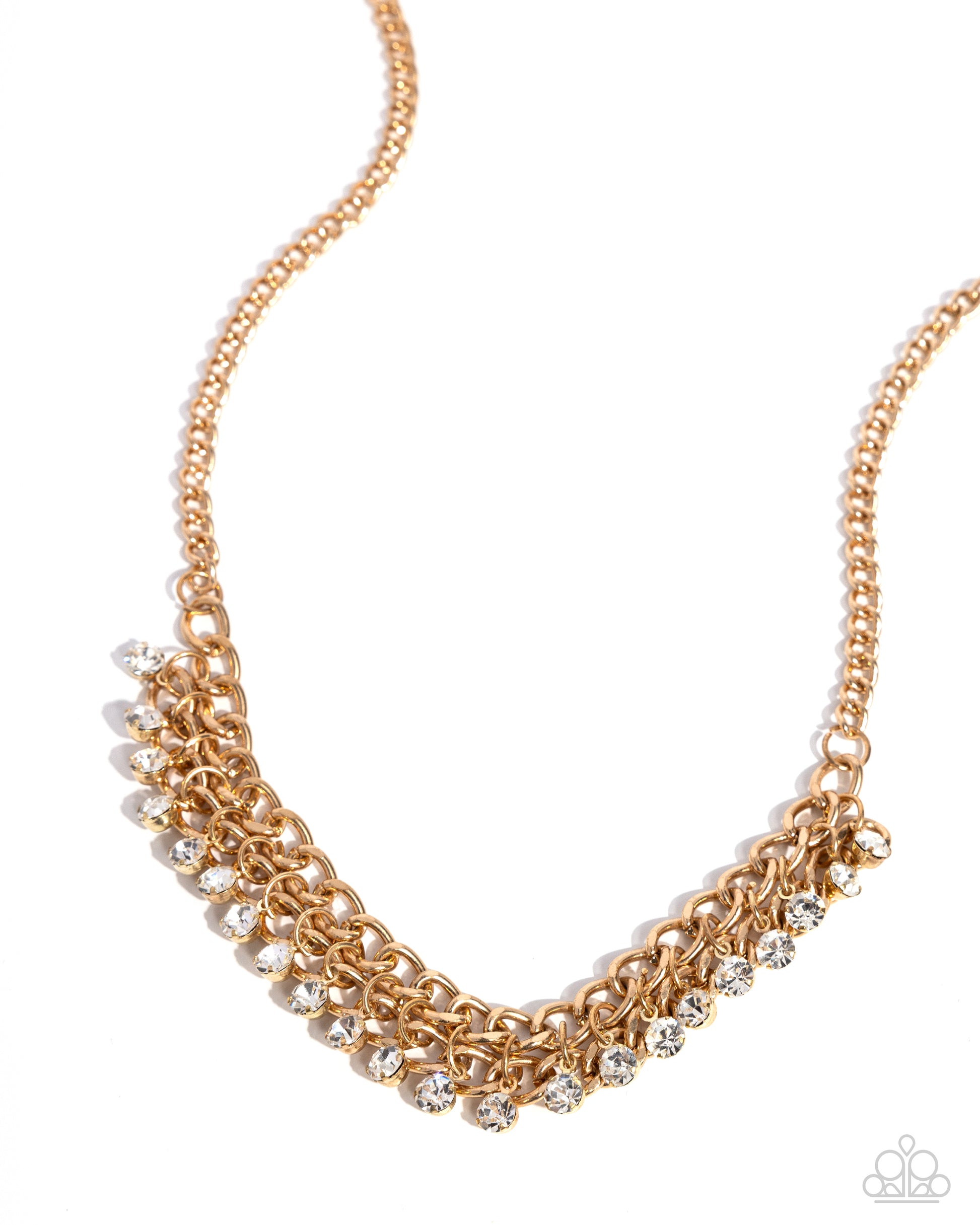 A fringe of glittery rhinestones swings from the bottom of a bold gold chain below the collar for a fierce look. Features an adjustable clasp closure.
