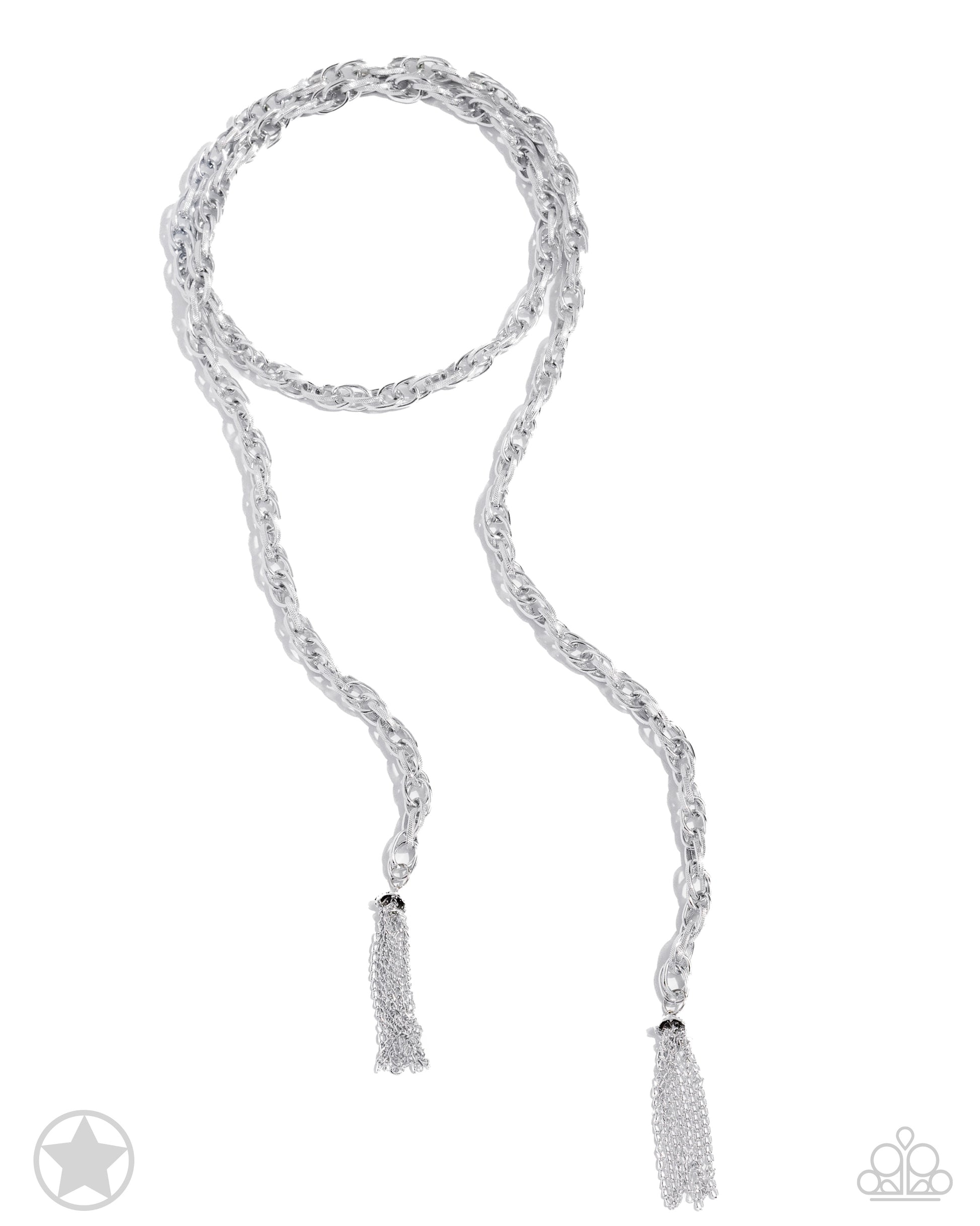 A lengthened strand of spiraling, interlocking abstract silver links, with light-catching texture, wraps around the neck, creating a layered choker-inspired necklace. Two tassels of classic silver chains cascade from both ends of the chain, adding dramatic length and versatility to the way the piece can be worn. Sold as one individual necklace. Includes one pair of matching earrings.