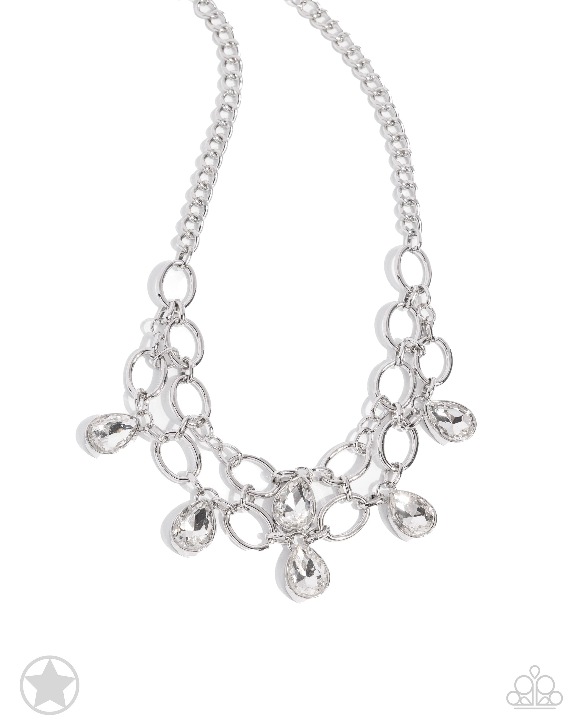 Joined by dainty silver links, two rows of dramatic silver chain layer below the collar in a fierce fashion. Glittery white teardrops drip from the glistening layers, adding a timeless shimmer to the show-stopping piece. Features an adjustable clasp closure.
