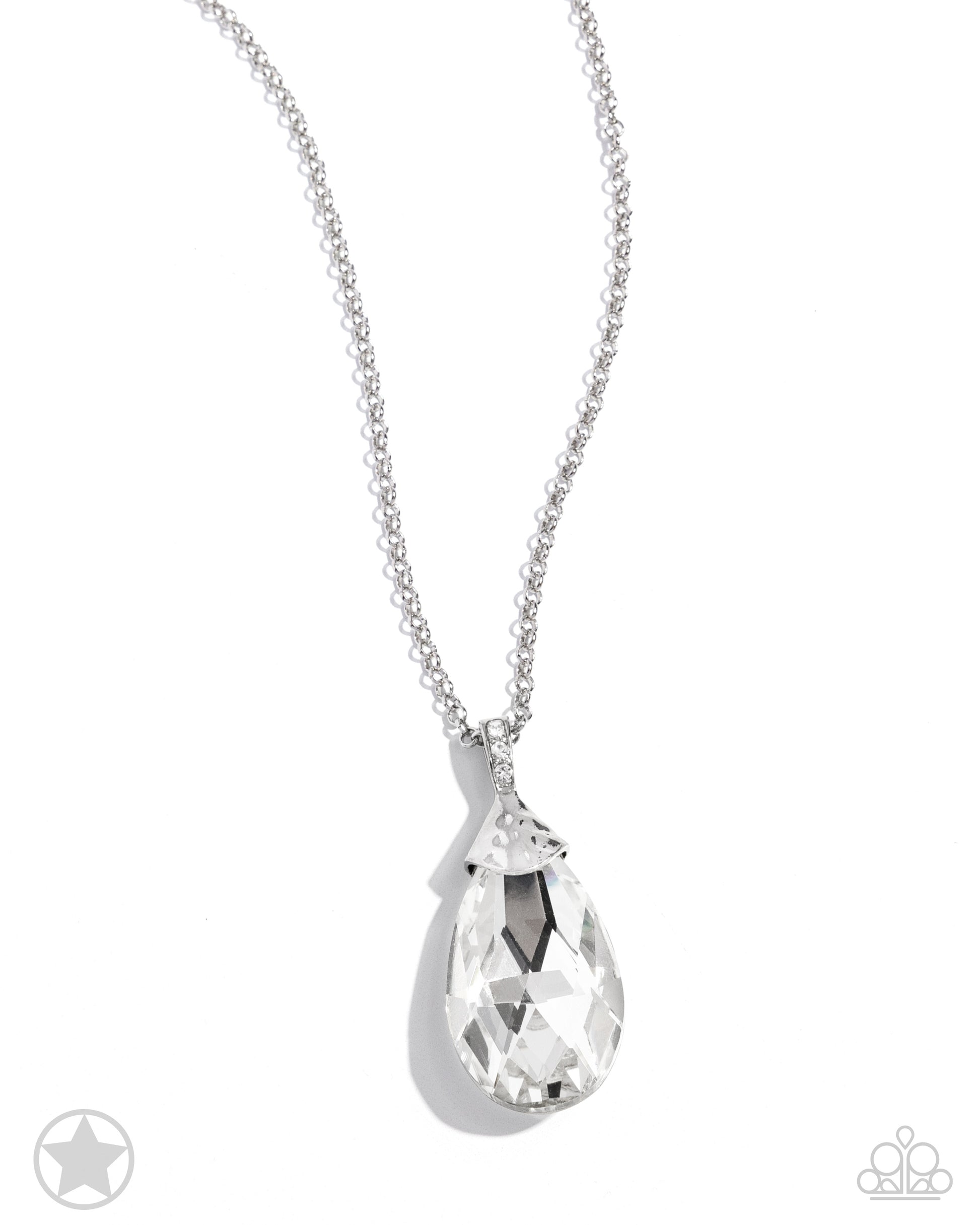 Infused with an elegantly elongated silver chain, a dramatic teardrop gem swings from the bottom of a white rhinestone encrusted silver fitting, creating a hypnotic pendant. Features an adjustable clasp closure.